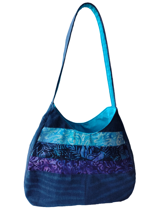 Large Denim Hobo Bag Tropical Beach Batiks - OOAK - Canadian Made - boho denim jeans purse - recycled jeans shoulder bag - aqua purple navy