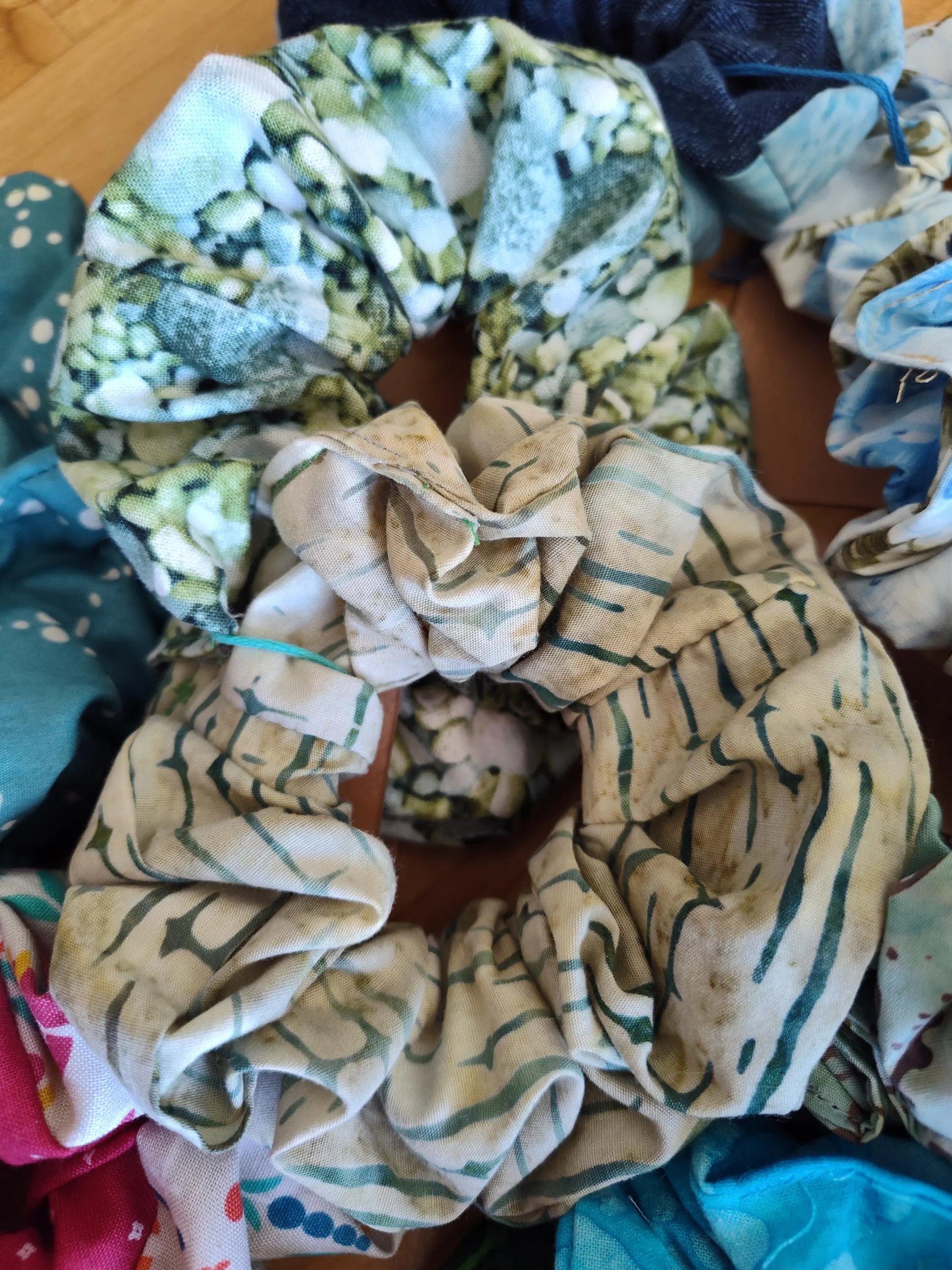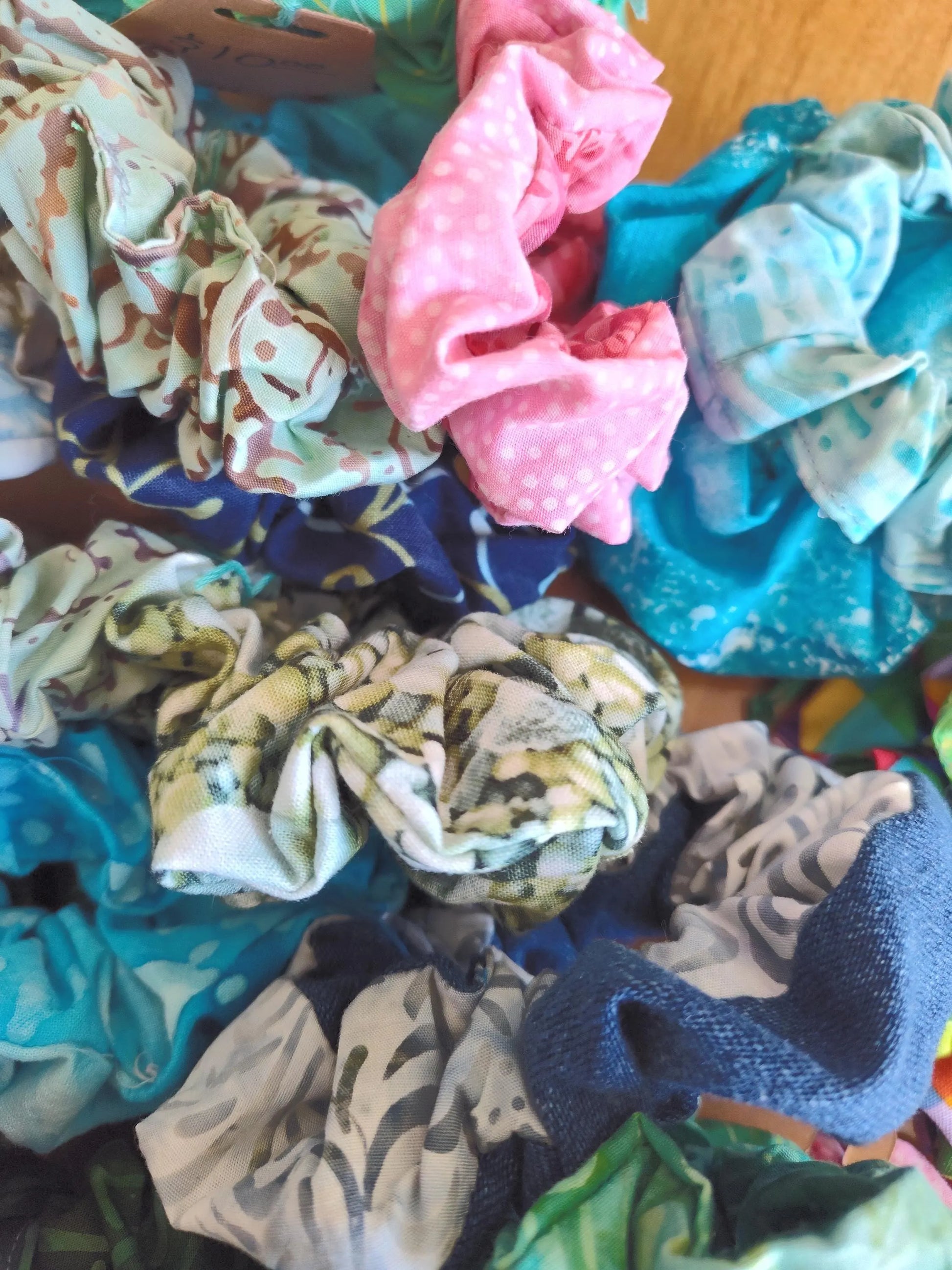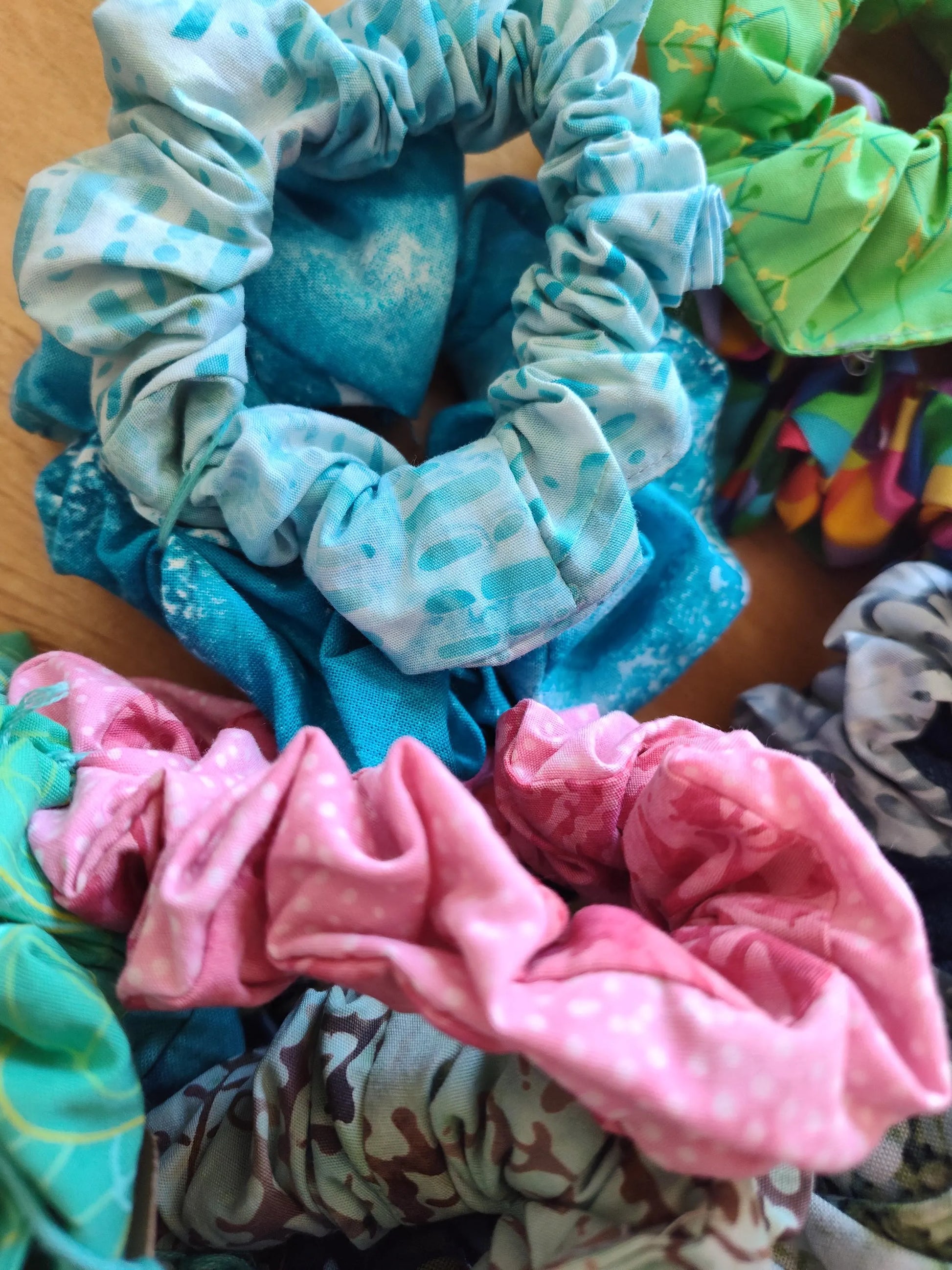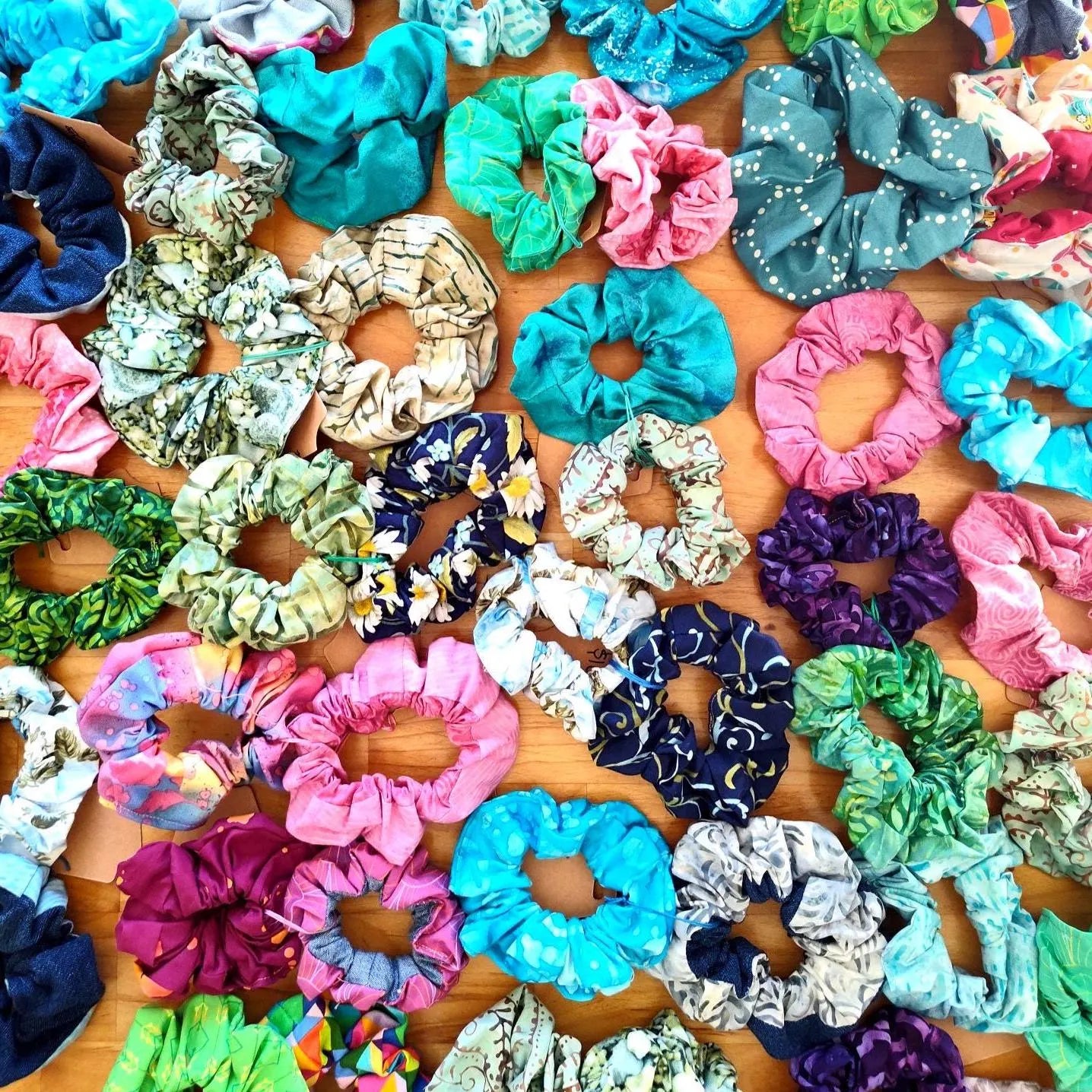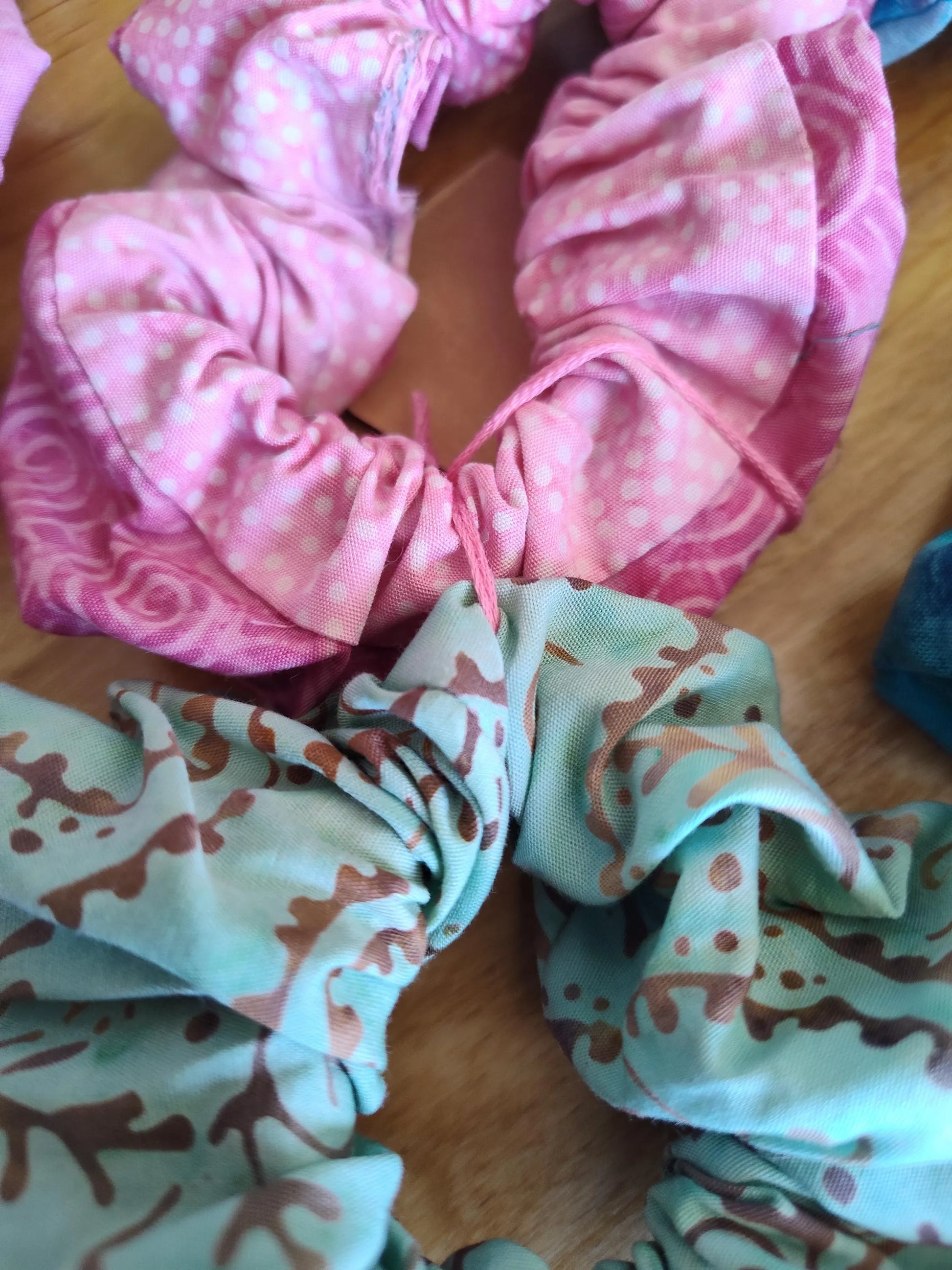 This mystery pack includes an assortment of stylish designs—some featuring rich, vibrant batik patterns, others in classic denim for a timeless look. Bold geometrics, beautiful florals, tropical batiks. Perfect for messy buns, comfortable ponytails, or wearing on your wrist as a cute accessory.